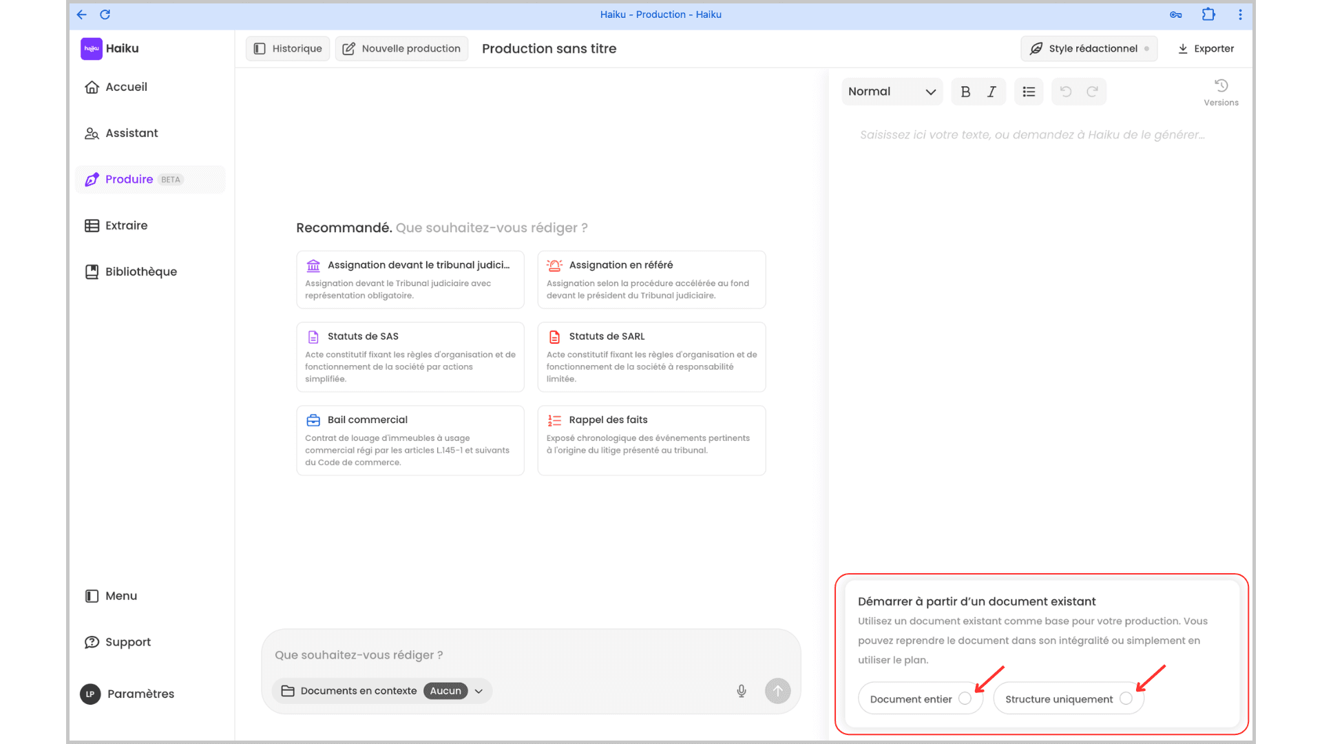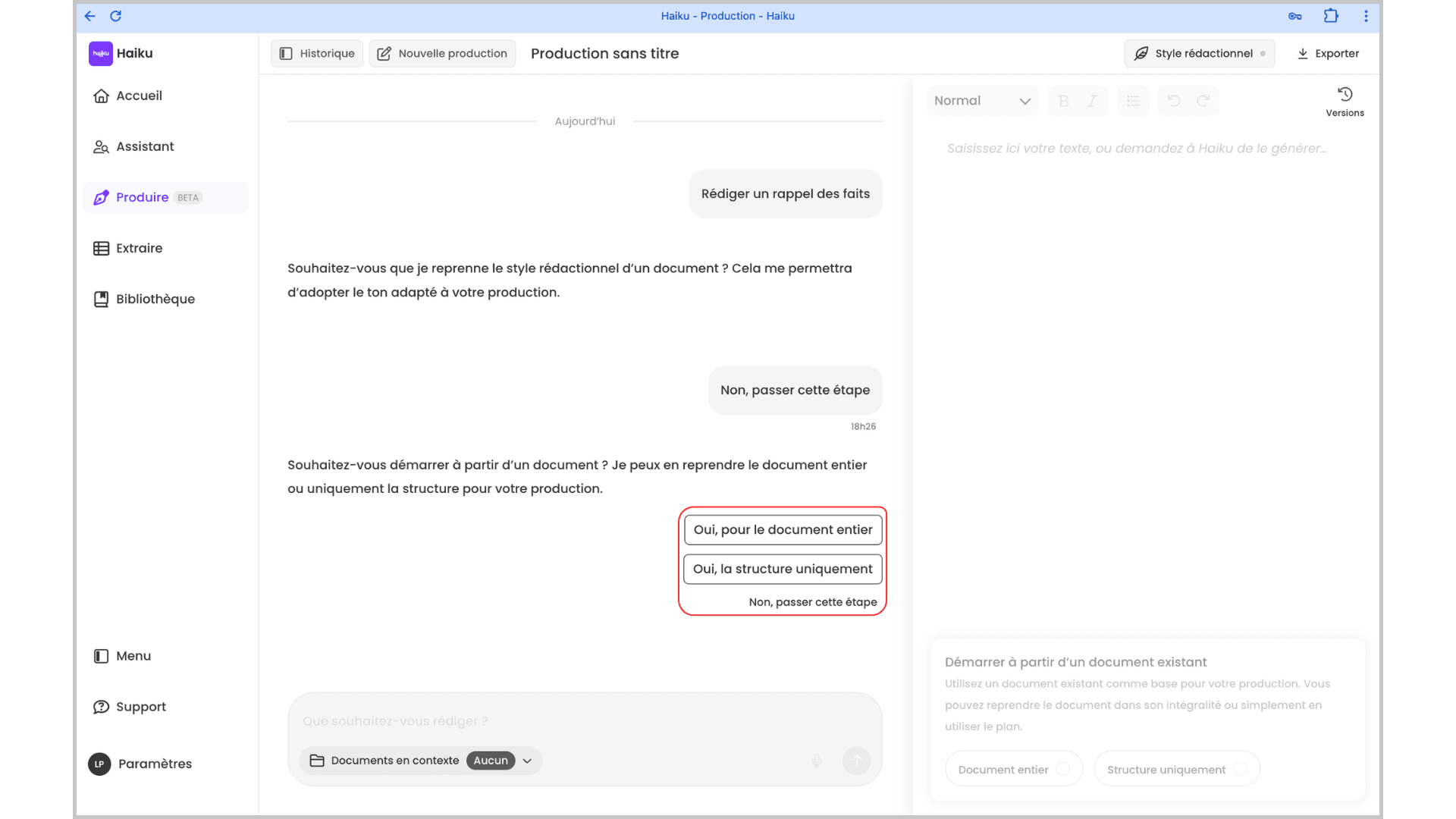 Si vous démarrez une production (ex. : “Rédiger un rappel des faits”), Haiku vous posera automatiquement la question :