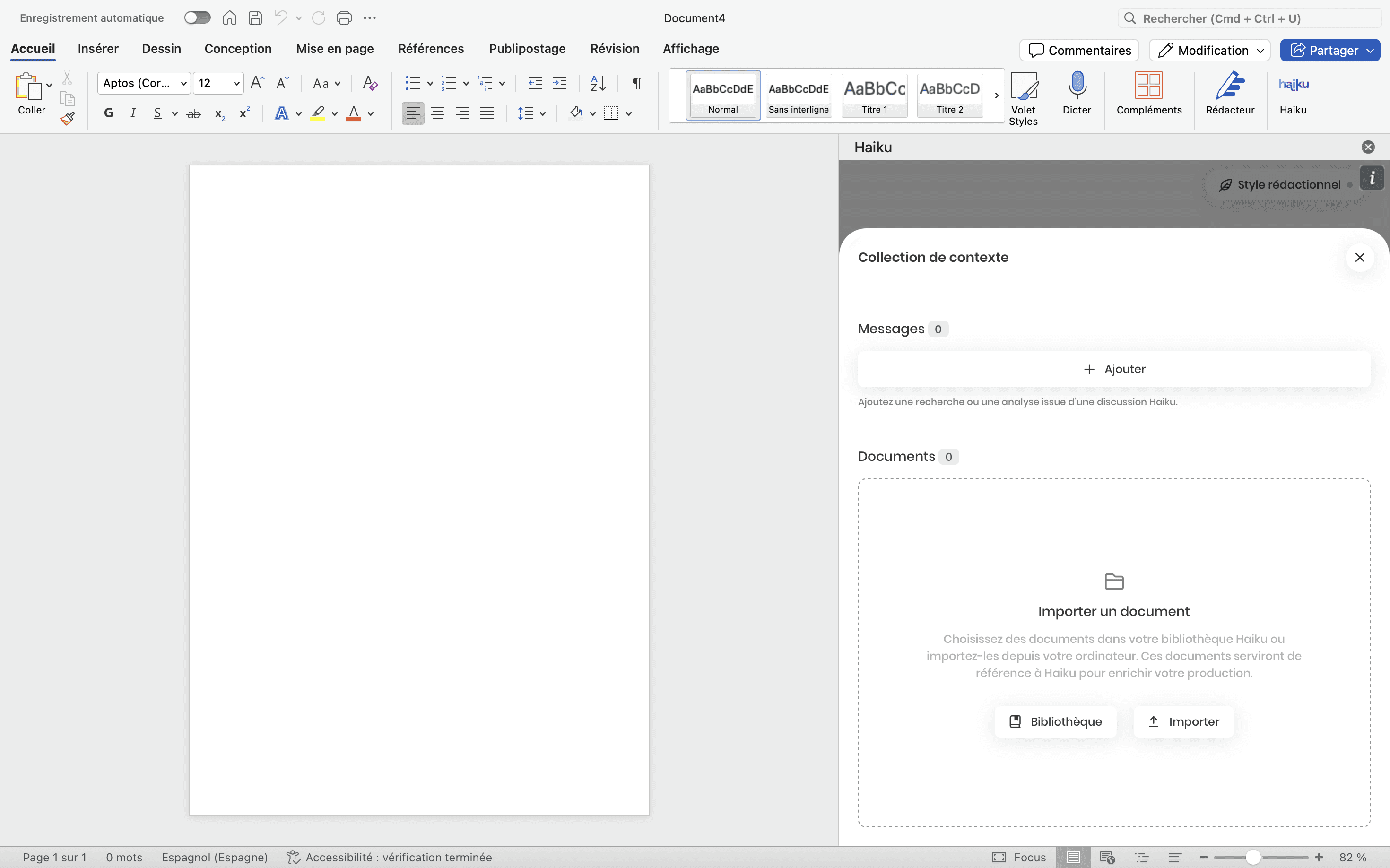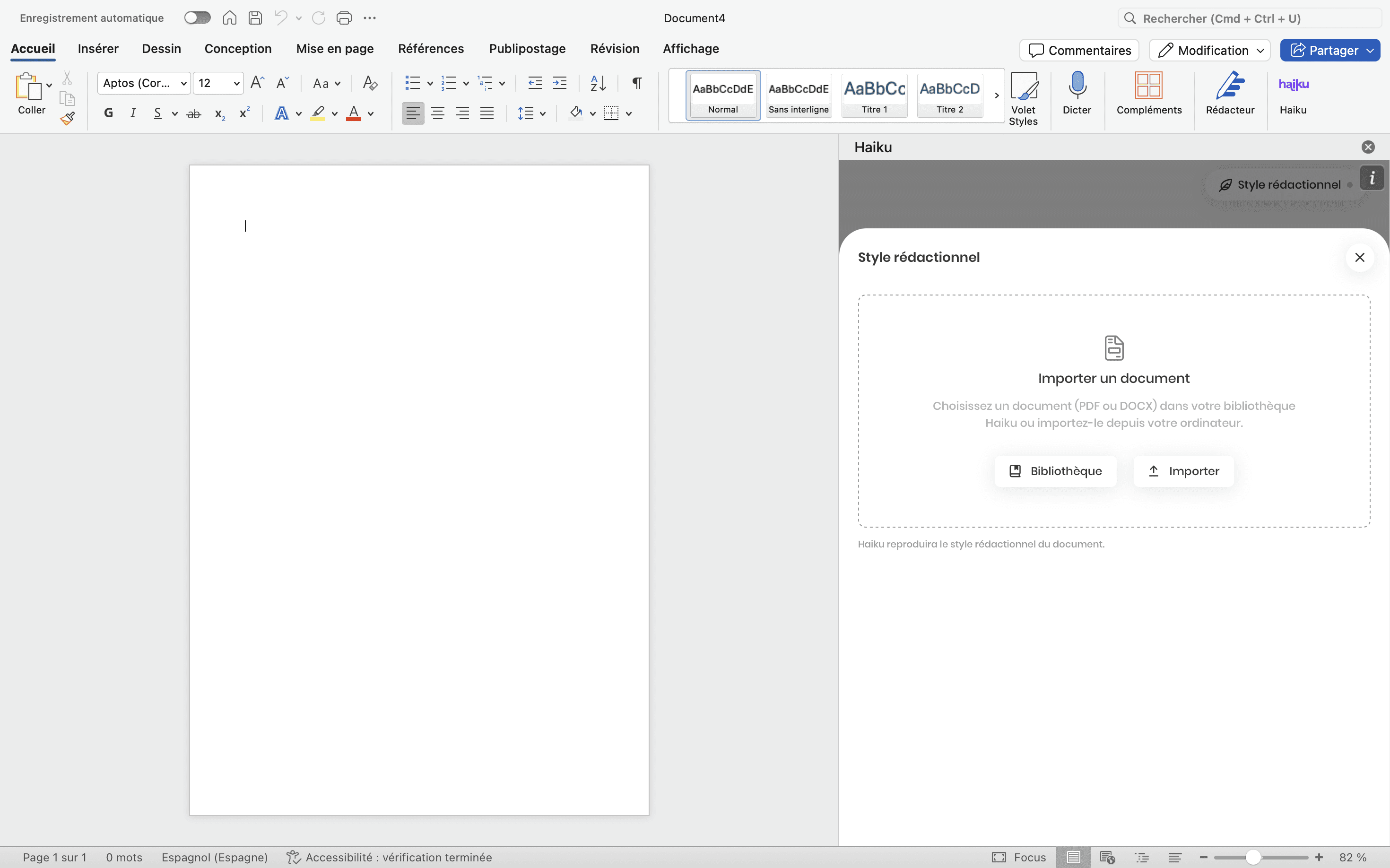 Une fois l'add-in installé, Haiku pour Word s’ouvre dans un panneau latéral, à côté de votre document.