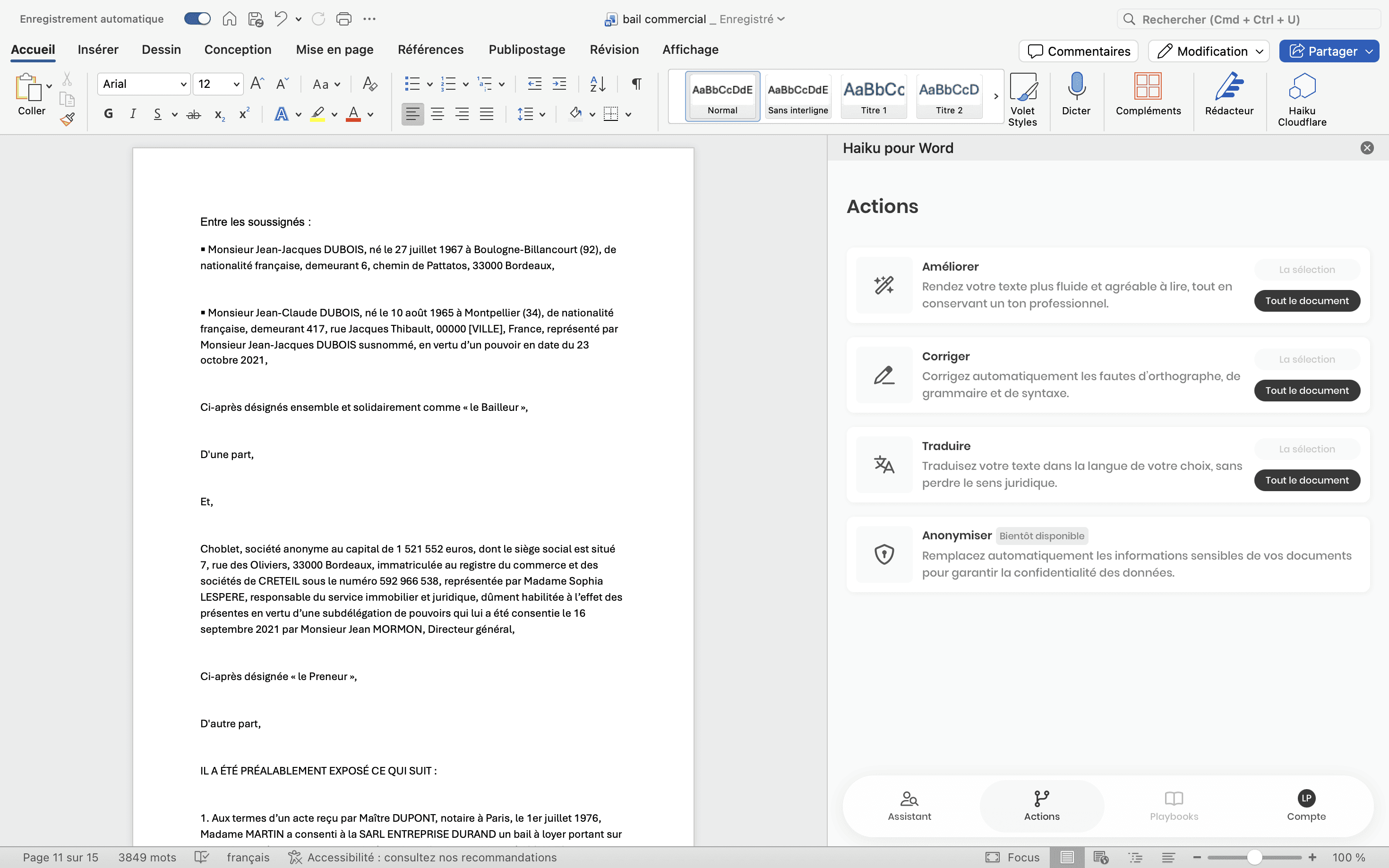 À savoir : Haiku est connecté aux lois et règlements, vous pouvez lui demander de modifier n'importe quel document ou partie de document à l'aune du droit applicable.