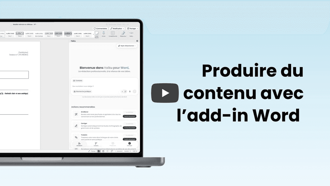 Concrètement, vous pouvez rédiger, modifier, corriger, traduire ou effectuer une recherche juridique directement depuis votre fichier Word. Haiku s’adapte à votre manière de travailler et intervient aussi bien sur l’ensemble d’un document que sur un passage précis.